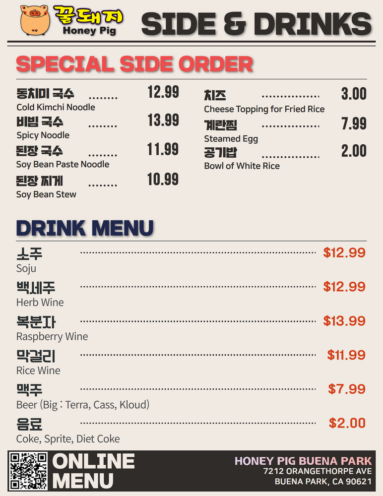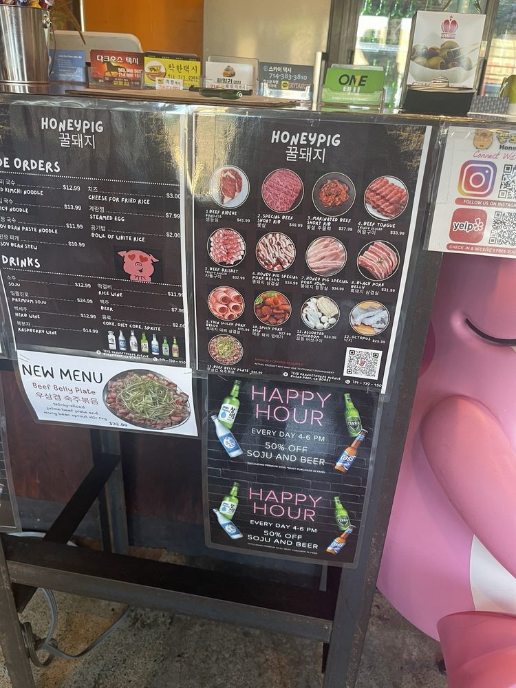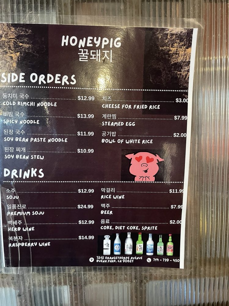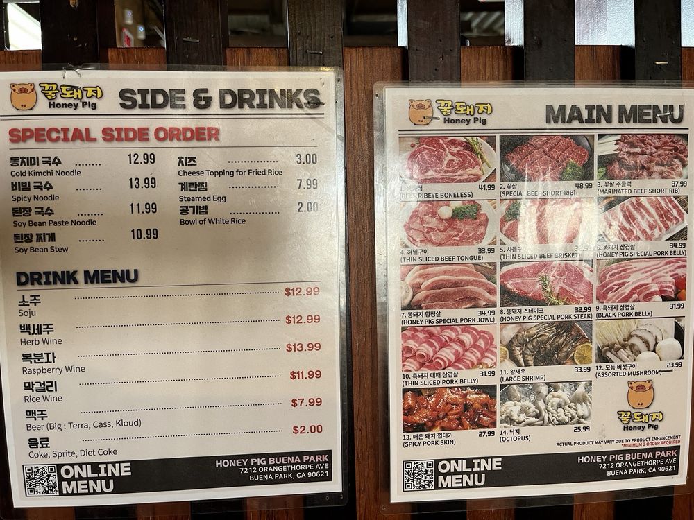 Introducing the menu at Honey Pig - Buena Park, a casual and trendy Korean BBQ spot that offers a wide range of options. The restaurant features many vegetarian choices, making it ideal for groups and families. With its wheelchair accessibility and waiter service, Honey Pig caters to various dining needs. Customers rave about the pork belly and beef brisket, praising the flavorful meats and attentive service. Some patrons recommend arriving early to avoid the crowds, while others note the greasy ambiance as a minor drawback. Despite the higher prices, the quality of the food and top-notch customer service make Honey Pig a must-visit for Korean BBQ enthusiasts in the Buena Park area.